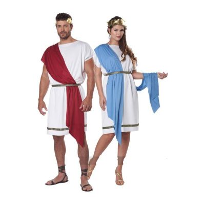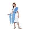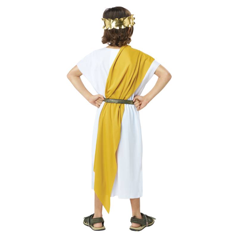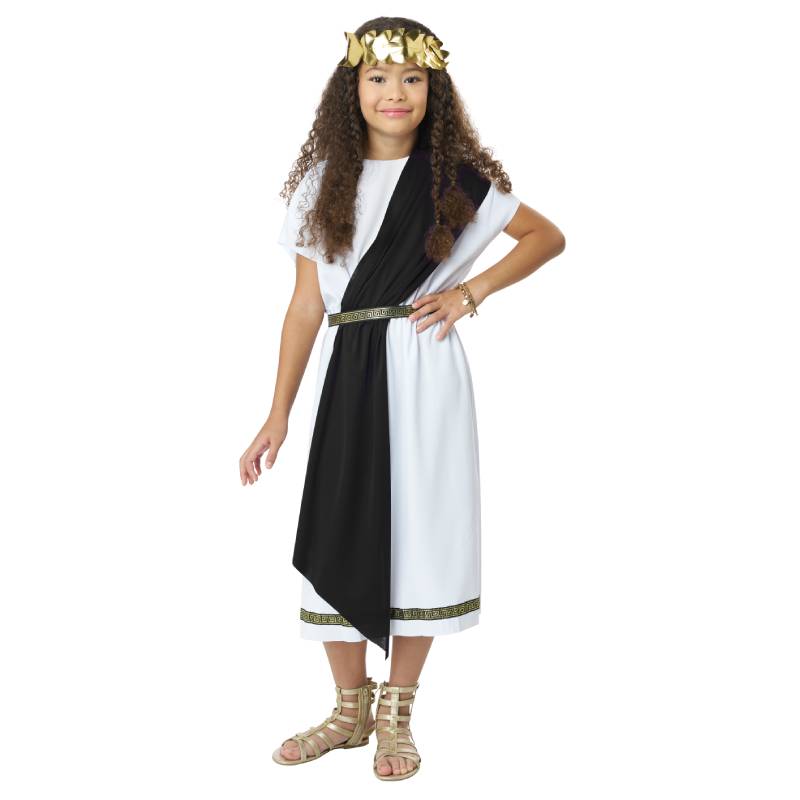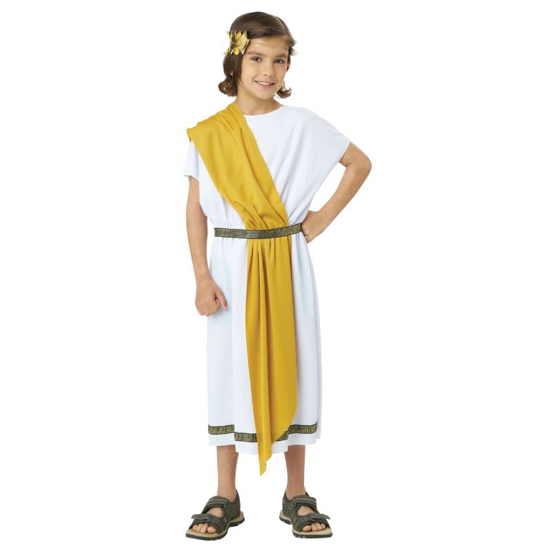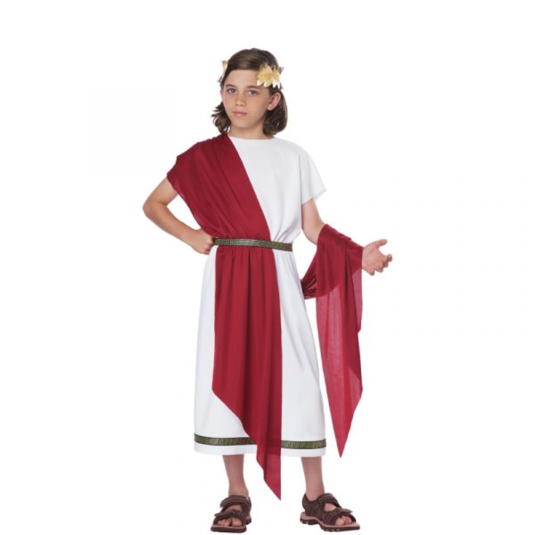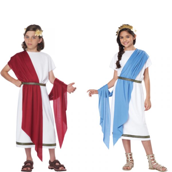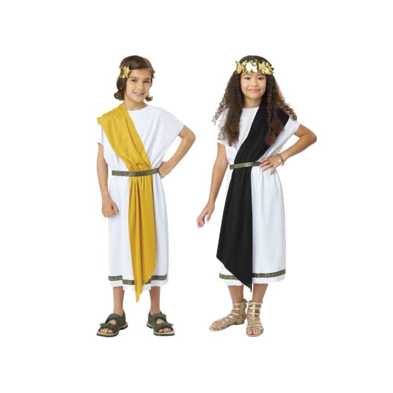 Basic Toga Child Unisex is a simple toga with a touch of style. This toga comes with 2 variations. The tunic is white with a gold and black patterned trim along the bottom hem. It comes with a belt which matches the trim of the tunic. 2 shawls are included. One red, one blue. It also comes with a gold leaf headband. The headband has an elastic band ensuring a comfortable fit throughout the event. Buy this for multiple occasions. Wear this for Halloween, theatrical productions, reenactments, school plays, projects, themed parties and more. Use this for themes including Roman, Greek, Egyptian, and biblical.
