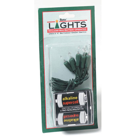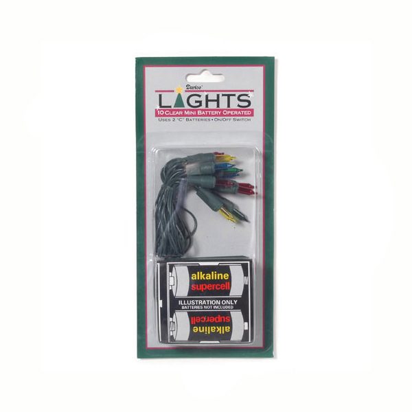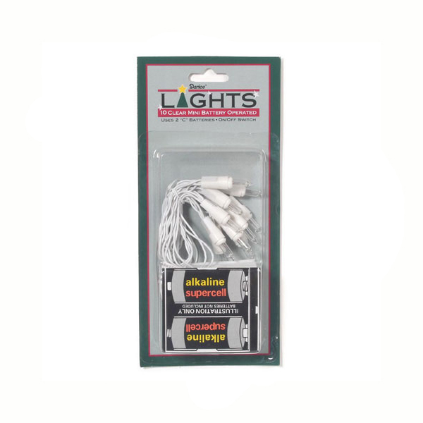 Battery Operated 10 Light Set. Decorative lights can be easy-to-use thanks to our battery-operated mini light set. Crafted with green wiring for blending into various wreaths and greenery displays, this versatile set includes 10 clear lights that create a classic, white glow.