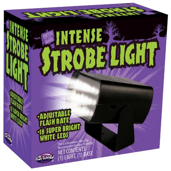 Battery Operated Intense Strobe Light has an adjustable flash rate. It is made of 18 super bright white LED’s. For indoor use only. Batteries not included. It takes 3 AA batteries.