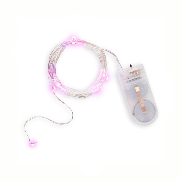 Pink Battery Operated LED Moon Lights are battery operated. 12 lights are on a 4.5′ long silver plated copper wire. 2 replaceable CR2032 batteries are included. On/Off switch. The wire holds its shape. LED lights are rated at 25,000 hours!