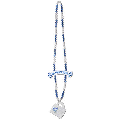 Beads with Oktoberfest Mug and Banner Bead measures 39″ around. The beads alternate blue and white every 3 beads. “OKTOBERFEST” bead connects either side of the necklace. A beer stein shot glass hangs at the end.