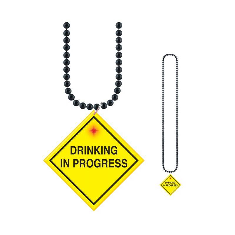 Buy Beads w “Drinking in Progress” Medallion for birthday celebrations. The necklace hangs about 33″. The medallion is about 2.5″ and has a red flashing light above the wording.
