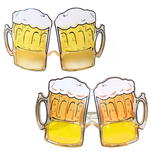 Yellow Lens Beer Mug Adult Sunglasses are shaped like a beer stein. They have a yellow lens with yellow beer stein with handles (it looks like it is a light beer such as Bud Light) and white foam on top.