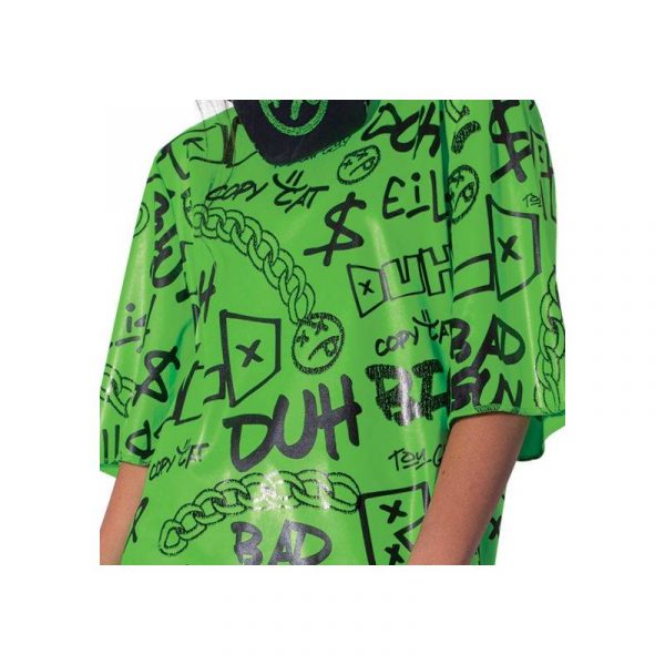 Billie Eilish Child Costume includes a top, shorts, head wrap and face mask. This American singer/songwriter became famous in 2015 with her song “Ocean Eyes.” The matching green wig features a double bun.