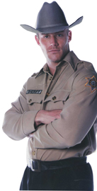 Police Shirt with Embroidered Patches. Button-down black Police Shirt with stitched-on Police badge. Available in two men’s sizes.