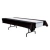 This Black and Silver or Black and Gold Plastic Tablecover has a wide stripe of Gold or silver down the middle and black on the edges that overhang a rectangular table.