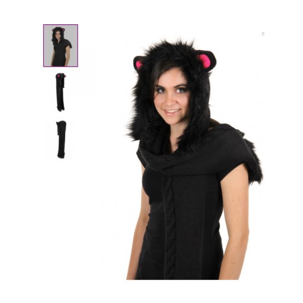 Here kitty, kitty! Keep warm this fall and winter wearing this Black Cat Hood! Black knitted hood features pink ears, fake fur trim and cable stitched edge.