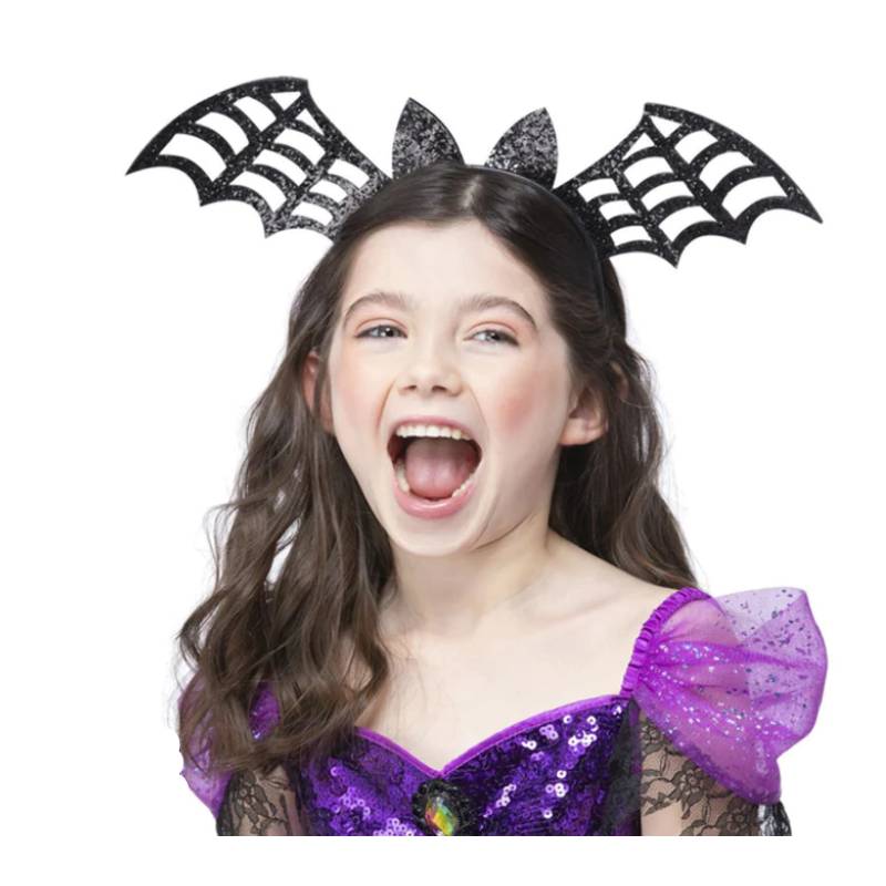 Black Glittered Flying Bat Headband is so cute! Wear this for many types of functions. This is an easy way to express your spooky side. Wear this for Halloween, themed parties, school functions, playdates, and more. Buy this to accessorize a vampire or witch costume. Can children be batty? I don’t know, but they can look like it!