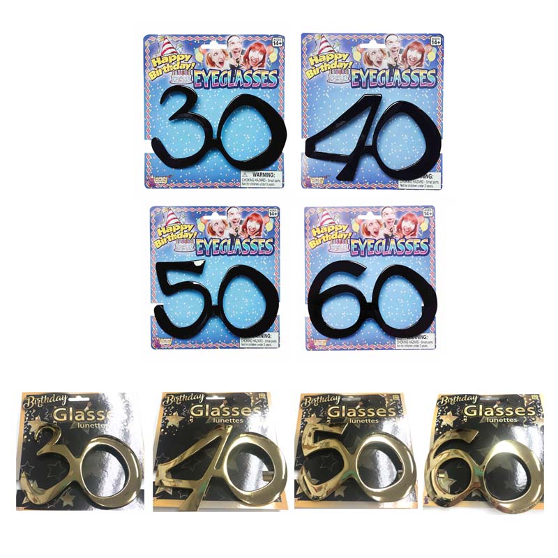 Choose from black or gold plastic birthday eyeglasses. Age-Related Eyeglasses available in number 30, 40, 50, or 60. Perfect for celebrating that milestone Birthday.