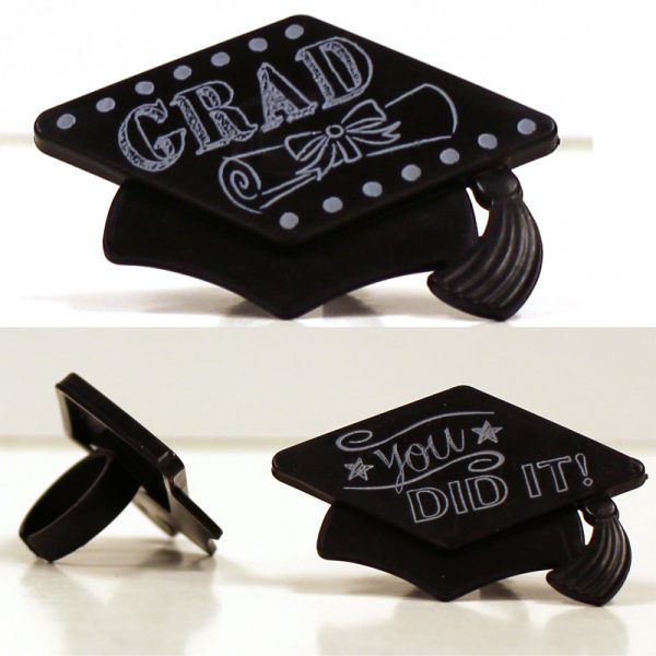Choose from two styles of these black graduation rings. One style says GRAD, the other says You DID IT! Sized to fit a child or an adult pinky finger, these rings feature a split, bendable plastic ring, black mortarboard, tassel and white lettering.