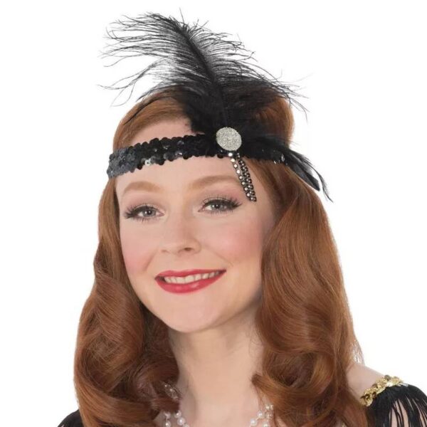 Black Sequin Flapper Headband. This 1920s costume accessory Flapper headband consists of a stretchy sequin headband with matching color feather, beautiful textured gem, and three dangling strands of rhinestones.