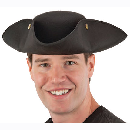 This black Tricorne hat can be used as a colonial or pirate hat. Fits adults, one size. Tricorne was the name of the original manufacturer of this 3 cornered hat.