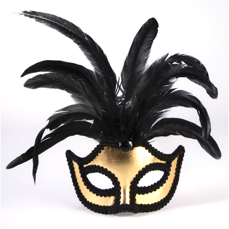 Wear a half mask with tall feathers to a masquerade party or Mardi Gras! This mask features a black braided trim and tall feathers that match the color of the mask! Select from Red, Purple, Black, Gold, or Hot Pink.