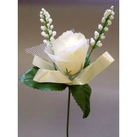 A single rosebud with tulle, ribbon and small white flowers on a 9 inch stem. This one is candlelight.
