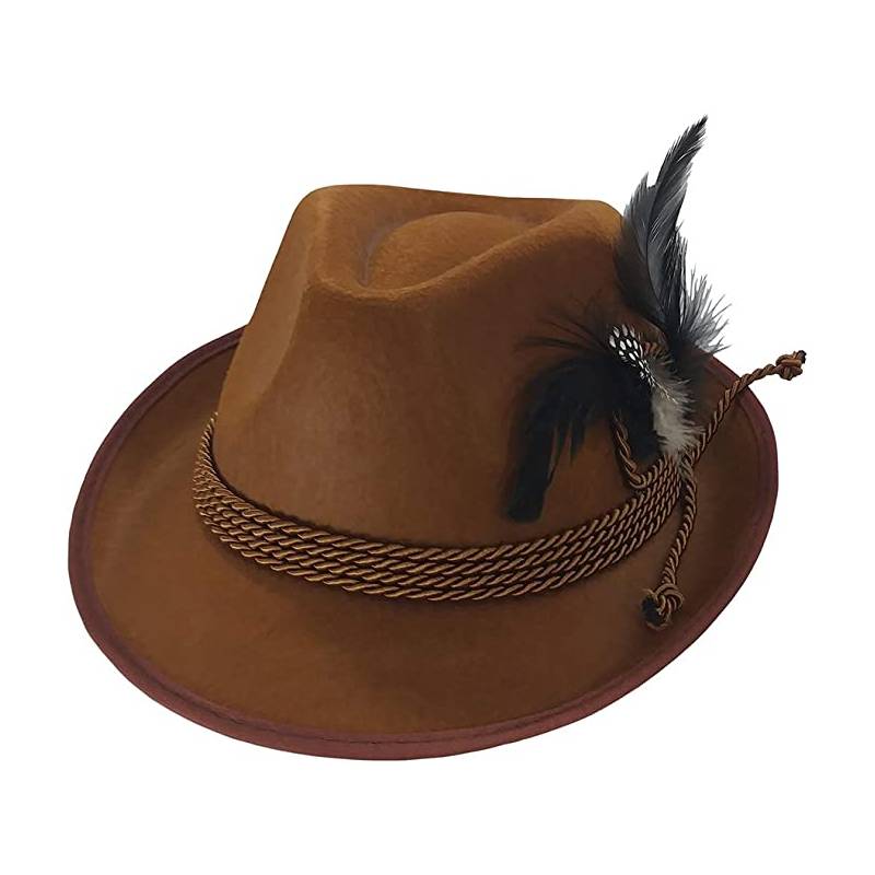 Brown Felt Bavarian Hat w Cording & Feathers is perfect for Oktoberfest celebrations. This hat has a cord wrapped around the base of the hat. One strand of the cord loops around a series of feathers. Wear this for festivals, themed parties, Halloween, reenactments and more. Traditionally called the Tyrolean hat, this style headwear came from the historical region in the Alps. Today’s Austria, Germany, Italy and Switzerland. Buy this for an authentic Bavarian look.