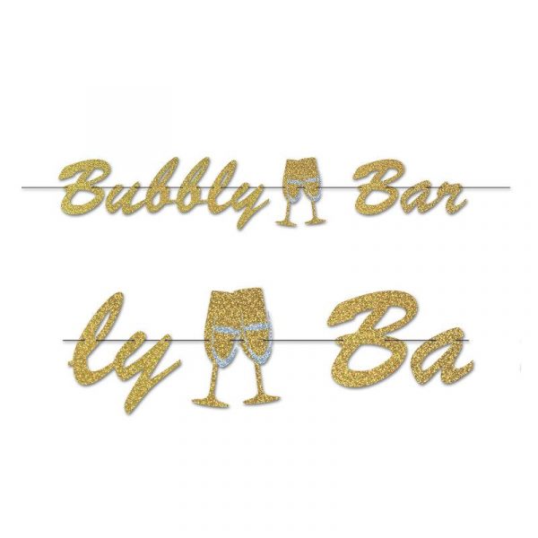 Bubbly Bar Streamer Gold Glitter is perfect for creating a fun and classy feeling. Two glittered champagne glasses toast in the middle, separating the two words. String this above the refreshments table or walls that look a little plain. Celebrate a new year in style. When you add this to your decorations, you create a high-toned atmosphere. Use this for parties at your house or large even centers.
