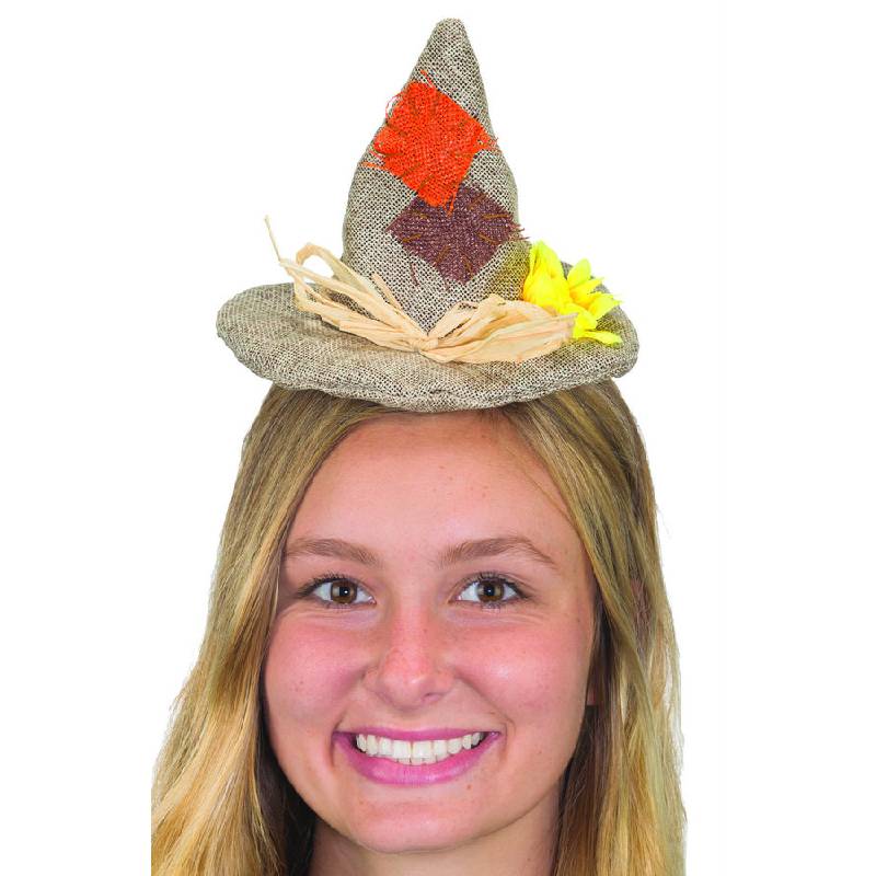 Wear a Burlap Mini Scarecrow Hat Headband with a sunflower and burlap patches! The removable headband features brown fabric covering.