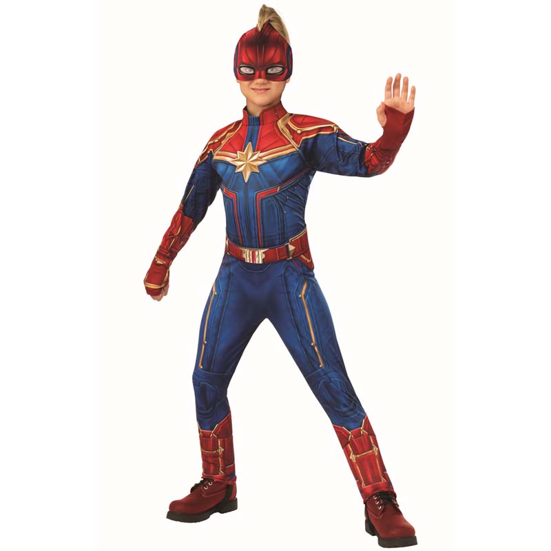 Captain Marvel Child Costume! Your child can enjoy being a superhero for Halloween! Costume includes mask and padded jumpsuit with 3D molded star logo. It also features a belt with molded buckle!