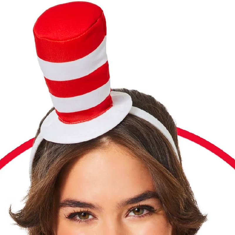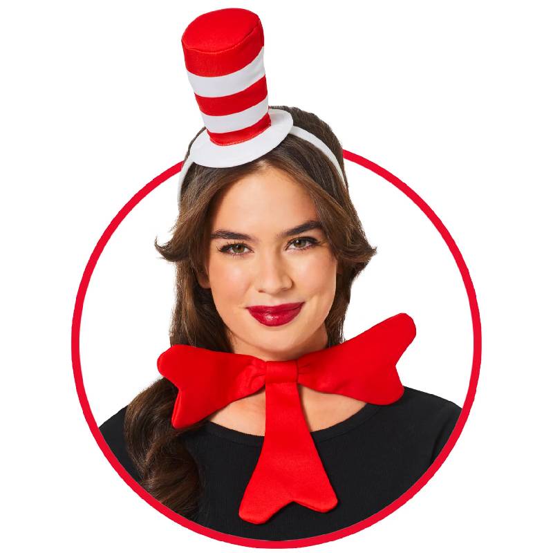 Cat In The Hat Accessories Kit includes a mini classic Cat In The Hat hat attached to a headband. The headband is covered in soft, white material. It also includes a character specific red bow tie. The bow tie attaches in the back. It is lightweight and easy to wear all day. This kit is perfect for office and school functions. Dress in appropriate attire and still show your love for this classic character. This is perfect for Halloween, themed parties, fundraisers, office or school functions, and more.