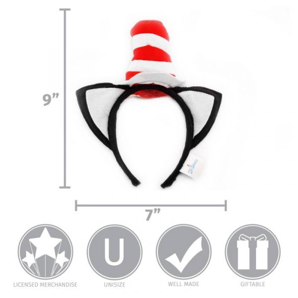 Have lots of good fun standing out when you wear this Dr. Seuss Cat in the Hat, Hat and Ears Headband. Designed with the beloved Cat in the Hat in mind, this headband will help you find the fun on dreary days. The sturdy plastic headband is encased in soft polyester to ensure comfortable wear for all day play. To make sure you can channel your inner cat in the hat, this headband features soft black and white ears and a pint-sized stovepipe hat just like the one made famous in the children’s book. Whether you’re playing up up up with a fish, or just looking for a whimsical everyday wearable, you’ll be ready to make some mischief in this Dr. Seuss Cat in the Hat Headband.