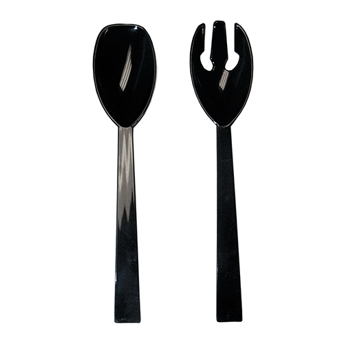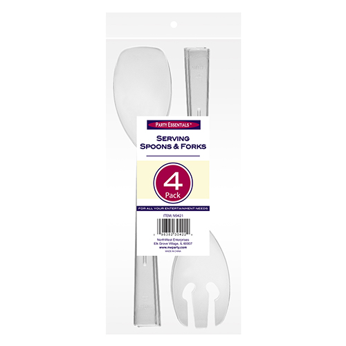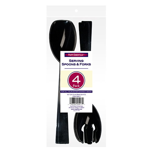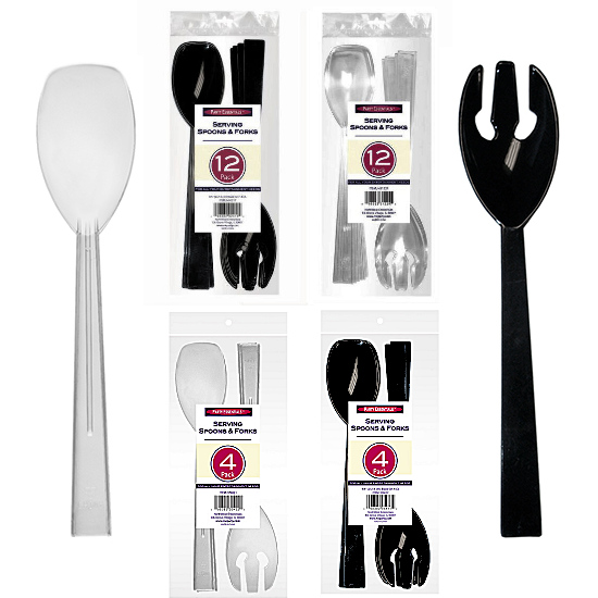 9.5″ Plastic Serving Spoons and Forks are available in 12 and 4 pack assortments of clear or black. 12 count packs include 6 serving forks and 6 spoons. 4 count packs include 2 serving forks and 2 spoons.