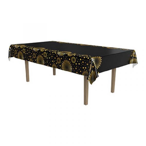Celebrate! Table Cover has gold bursts and circles. This is versatile- use it for birthdays, anniversaries and milestone accomplishments. It is plastic so clean up is easy!