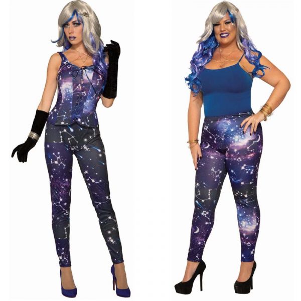 Choose from Standard or Plus Size! Wear a pair of Celestial Galaxy Leggings to your next dance, party or event! Leggings feature a blue and purple background with white designs of constellations in the night sky.