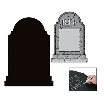 Chalkboard Tombstone Cutout measures about 21.75″ tall. You are able to write on both sides. One side has a gray tombstone design with R.I.P. and a spot in the middle to put a name or message. The other side is completely black.