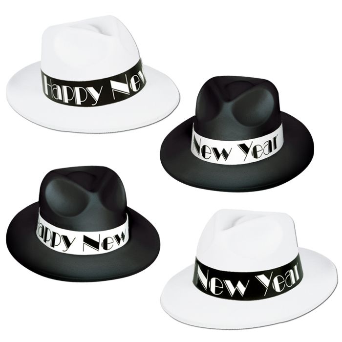 These fedora-style hats will add class to your New Year’s celebration! Featuring a classic design in black or white with an alternating black or white band, these hats were made to pair with champagne and friends on New Year’s Eve. Wear one yourself as the host or hostess, or pass them out and let the party begin! Made of plastic-backed velour. Black with a white band or white with a black band. Reads “Happy New Year” for your New Year’s Eve celebration. Adult sized.