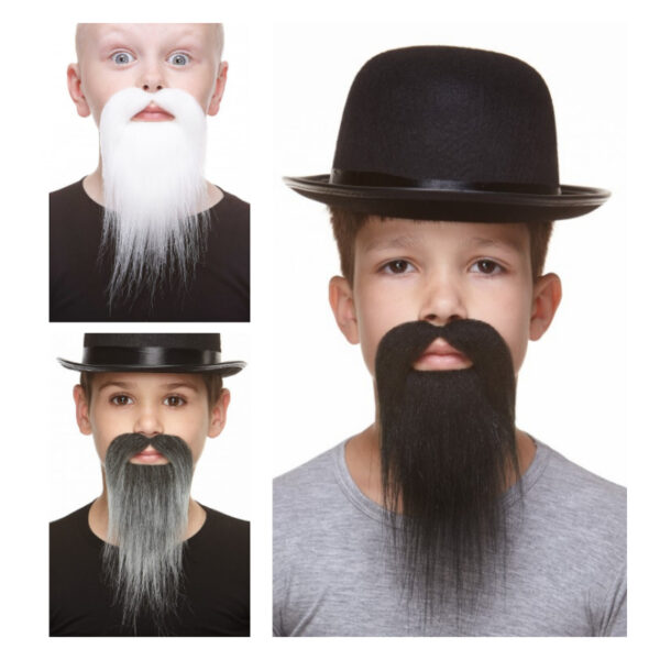 This child size beard and mustache set is perfect for school events and projects, disguises and costumes! The White or Salt & Pepper colors are ideal for celebrating the 100th Day of School! This self-adhesive mustache & beard is handmade and attaches by means of a specific medical 3M plaster (on the back). The anti-allergic plaster does not irritate the skin, is easily stuck and removed.