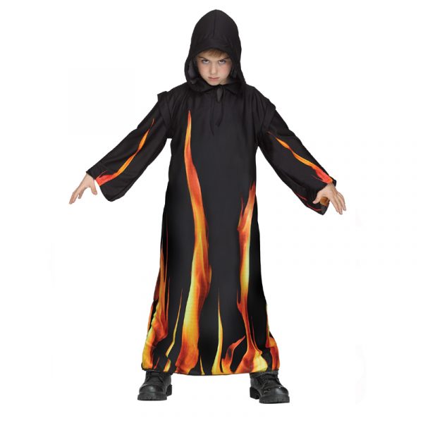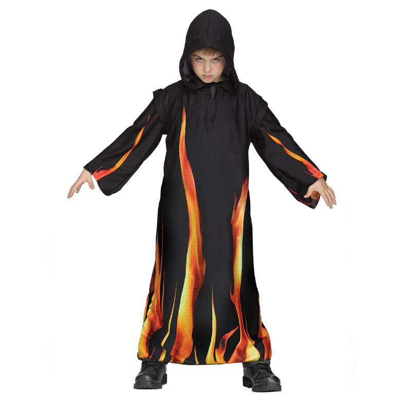 Childs Black Hooded Burning Robe makes a great Halloween costume. The colors of the flames which shoot up from the bottom of the robe are very vivid, and eye catching! Childs Black Hooded Burning Robe can be used as an evil magician, devil, or vampire costume. It is available in 2 kids sizes.