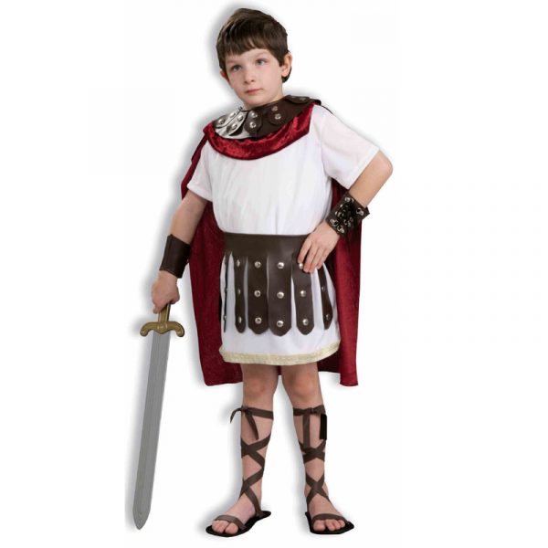 This kids Roman gladiator costume includes tunic, collar with attached cape, wrist cuffs, and belt. The perfect costume for a Christmas or Easter play. Sword and roman sandals sold separately. Available in 2 kids sizes, see below.
