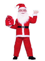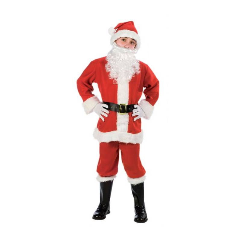 Child’s red Santa Suit costume includes hat, jacket, belt, gloves, boots, and pants. Perfect for a school Christmas play or sing along!