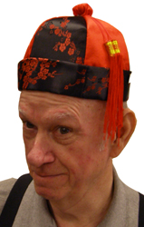 Fabric Chinese design hat with tassels. Hat fits small adult head or child’s head.