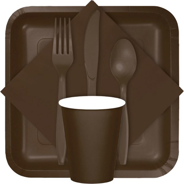 Striking and colorful, our collection of Chocolate Brown Tableware, Table Covers, and Utensils includes a selection of paper and plastic plates, cups, napkins, placemat/placemats and utensils. This collection also includes several choices of table covers, as well as a matching table skirt. Chocolate Brown tableware make a bold foundation for your birthday party, school function, sports themed party, or a host of other themed events.