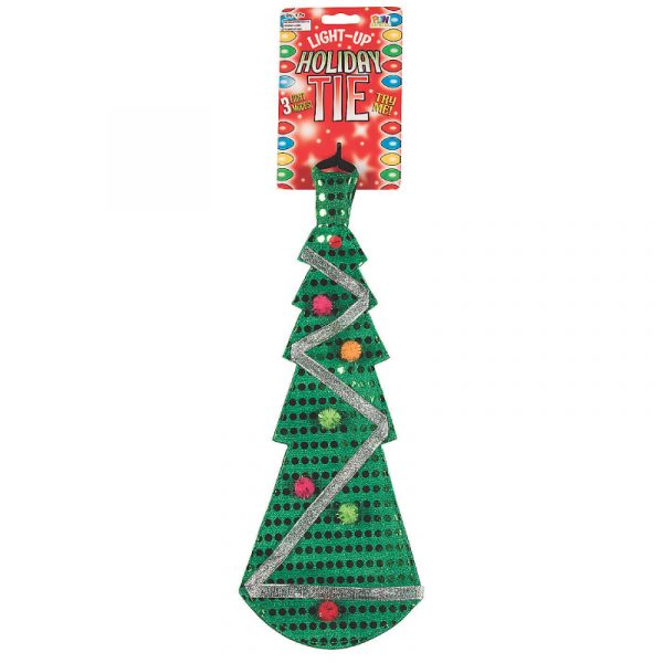 Christmas Holiday Light-Up Tie will go perfectly with your ugly sweater outfit. Wear this instead of a traditional tie to an office get together. A black elastic strap wraps around your neck for a comfortable fit. This is a green tie with silver ribbon, green metallic circles, multicolor pom poms and blinking lights down the center. The lights blink at various speeds, just keep pressing to on/off button until you reach your desired speed.
