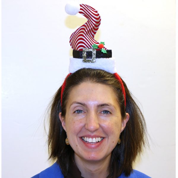 Curvy, Christmas Swirl 6″ Fabric Santa Hat Headband. Features red and silver swirled fabric on a felt covered headband. Wear to a party this Season!