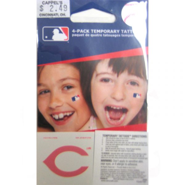 Reds Tattoo. Officially licensed temporary Cincinnati Reds wishbone “C” logo tattoos. Each tattoo package comes with a collection of 4 tattoos. Each one is a 1.25″ x 1″ temporary tattoos. Tattoos are applied with a wet cloth and easily removed with clear tape. Made in USA.