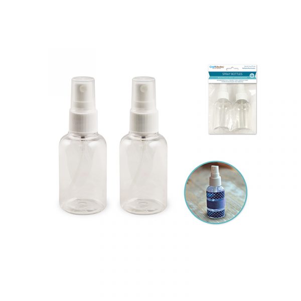 Clear Plastic Spray Bottles are environmentally friendly. They have a non-aerosol pump. They hold about 2.6 fluid ounces. 2 per package.