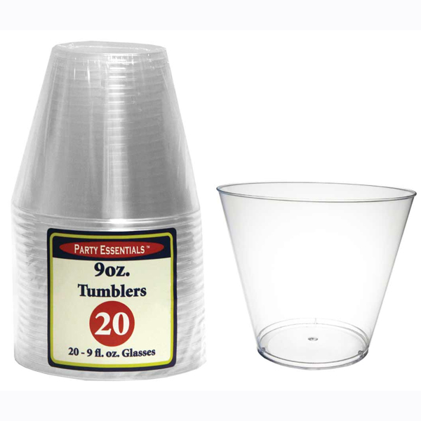 These disposable tumblers make for an easy clean up. They are 9 ounces each and come 20 in a pack. These tumblers are sturdy and a great option if you want to have a nice looking set up with out worrying if your favorite china will be broken. Also, these would be perfect for a camp out, cook out, and for any type of party you want to look good for a great price!