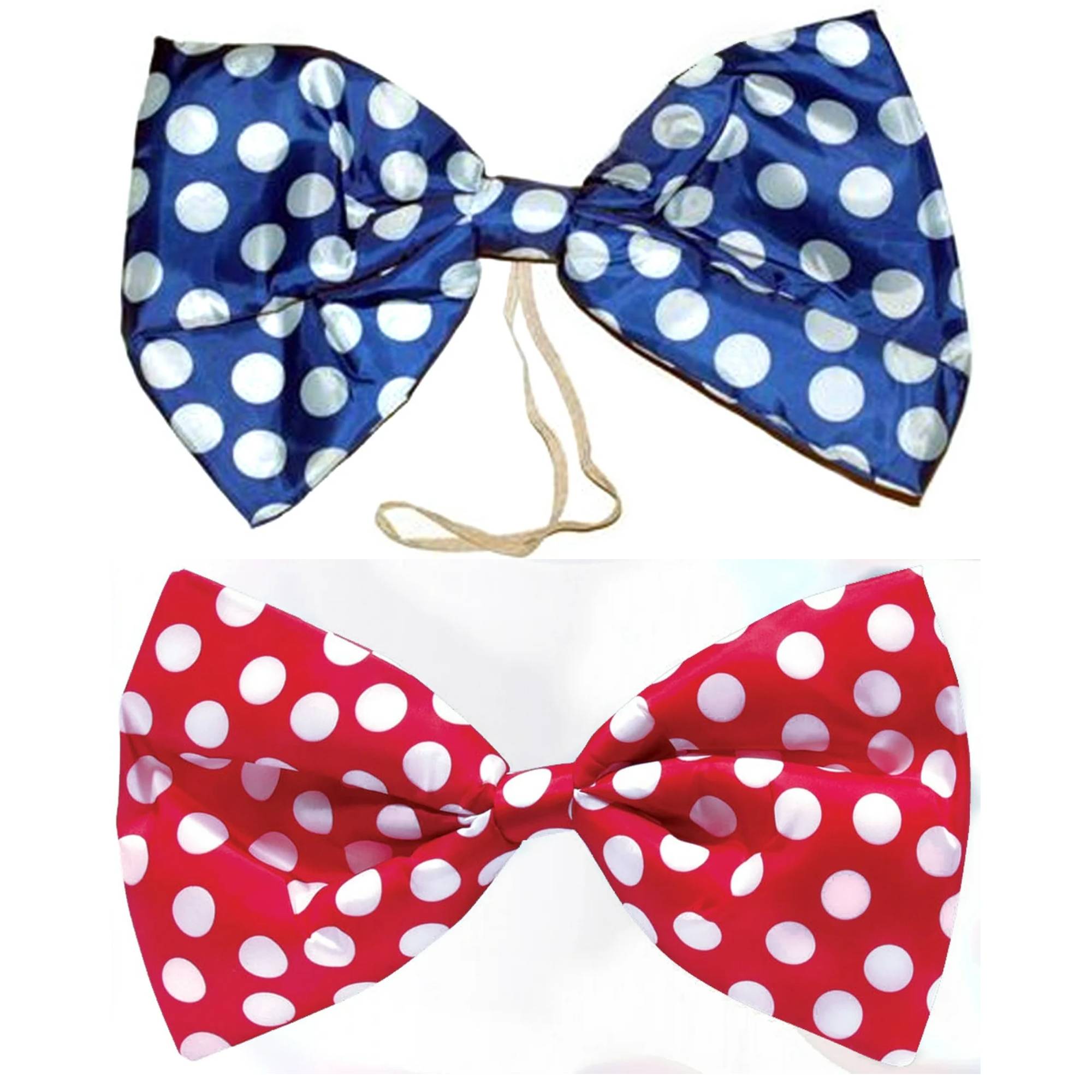 This Jumbo bowtie features white polka dots. Choose from available in Red with White Polka Dots or Blue with white polka dots. Both styles have an elastic band to hold them in place. This bow tie measures about 12″ across and about 7″ wide.