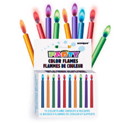 These birthday candles are slightly smaller than a regular birthday candle. There are 2 red, 2 purple, 2 green, 2 orange and 2 blue candles, as well as 10 clear plastic holders in this set. When you light the candles, the flame burns the same color as the candle.