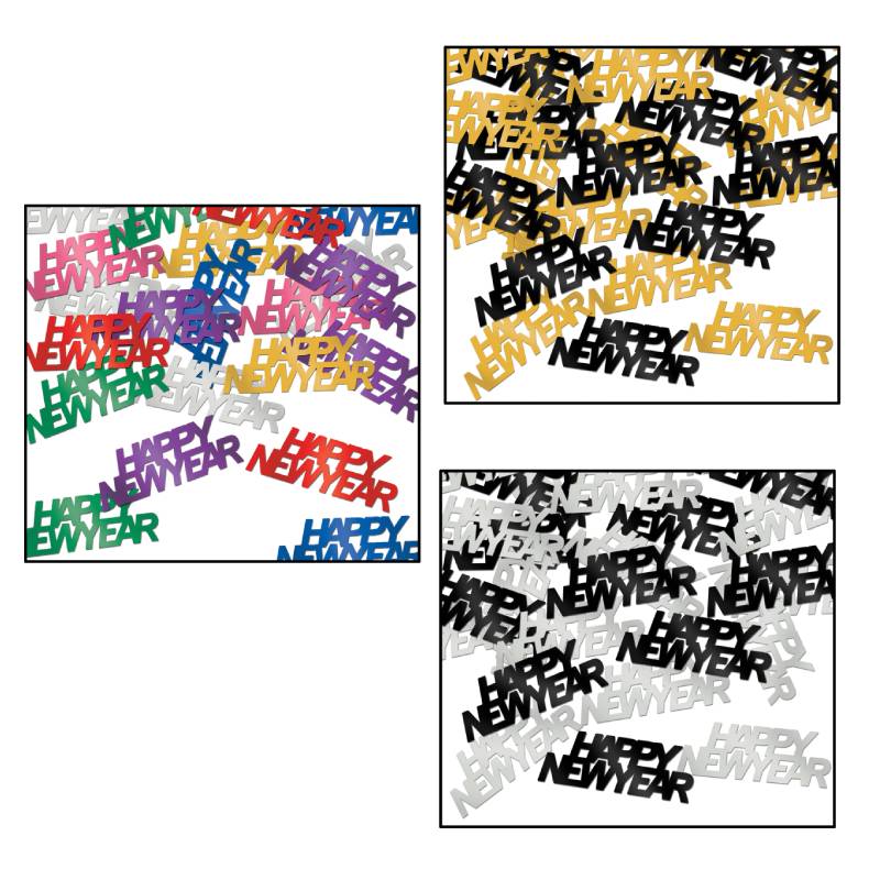 Happy New Year Confetti. Each package contains words, “Happy New Year” in either black and silver, black and gold, or multi-color. It is a great way to brighten up a table.