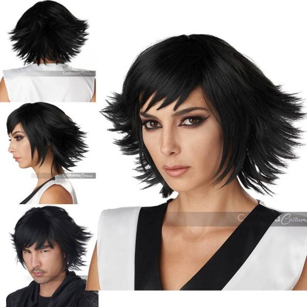 The Feathered Cosplay Wig is a short feathered bob in black. Buy this to complete your ninja, samuri costume, or any number of our costume selection.