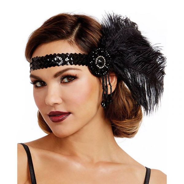 Costume 1920s Sequin and Jeweled Flapper Headpiece w Feather is the perfect accent accessory for your 1920’s themed outfit. The feather is held in place with a dazzling jeweled embezzlement. Wear this exquisite accessory for Halloween, drag outfits, plays, cosplay or your own unique look.