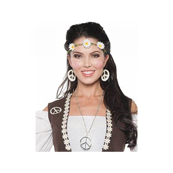 Costume 70s Daisy Headband or Choker has 5 daisies attached to natural looking twine with green silk petals woven throughout. It is attached to a black elastic strap that secures the headband/choker around your neck or head. Wear this for Halloween, plays, theatrical productions, themed parties and more.