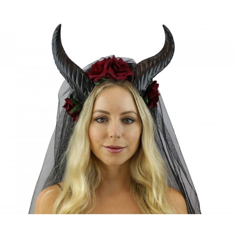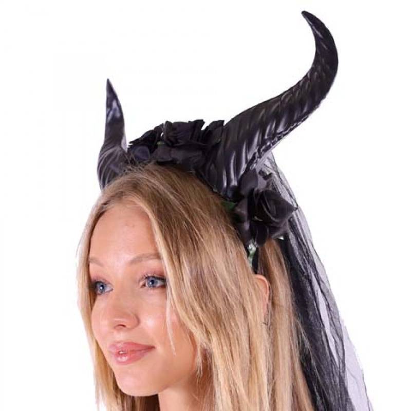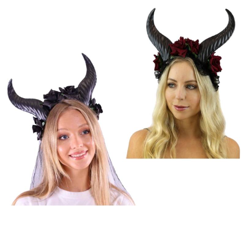 Costume Black Horns Headband w Floral Trim will be a beautiful addition to you costume creation. Wear this to fantasy-themed parties, Halloween parties, cosplay, goth attire and more!
