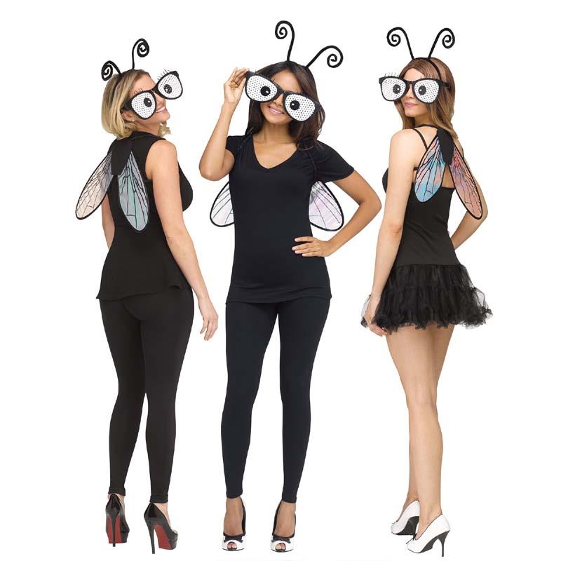 Surprise your friends with this Costume Buggin Out Insect Accessory Kit. Kit includes over-sized “bug-eye” eyeglasses, curly insect headband, and a pair of fly-type wings.