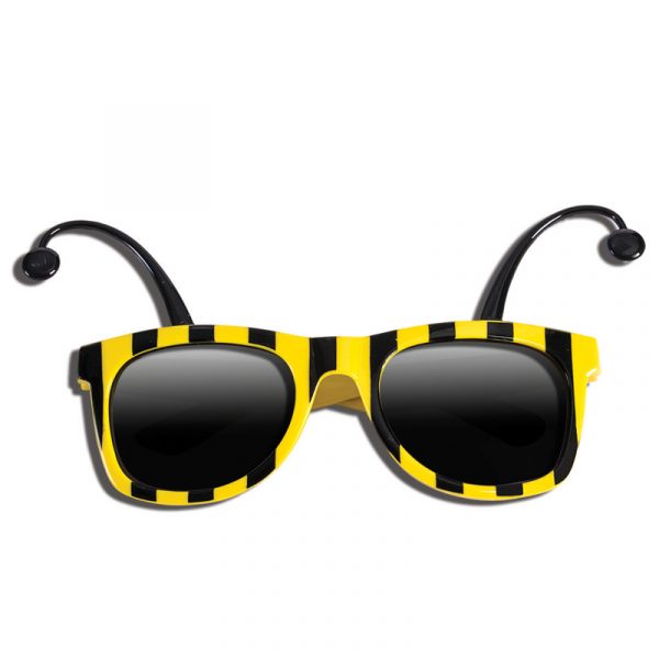 Costume Bumble Bee Eyeglasses have dark lenses. They are yellow with black vertical lines. On the top of the glasses, 2 antennae sprout out, one to the left, the other to the right.