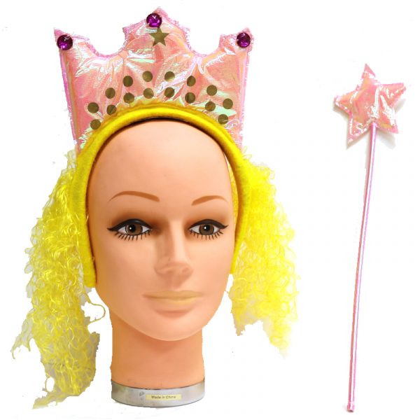 Wear this crown headband with bright yellow curly locks of hair to play princess, or the good witch Glinda from Wizard of Oz. Matching star wand measures 14″ long. 3.5″ tall, iridescent pink tiara/crown features sewn-on purple plastic gem stones.